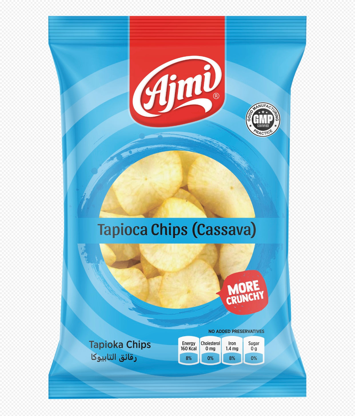 Satisfy your crunch cravings with Ajmi Tapioca Chips. Made from premium cassava (tapioca) and expertly fried for a "More Crunchy" texture. This popular snack is seasoned to perfection, offering a delicious, irresistible, and wholesome alternative to potato chips.