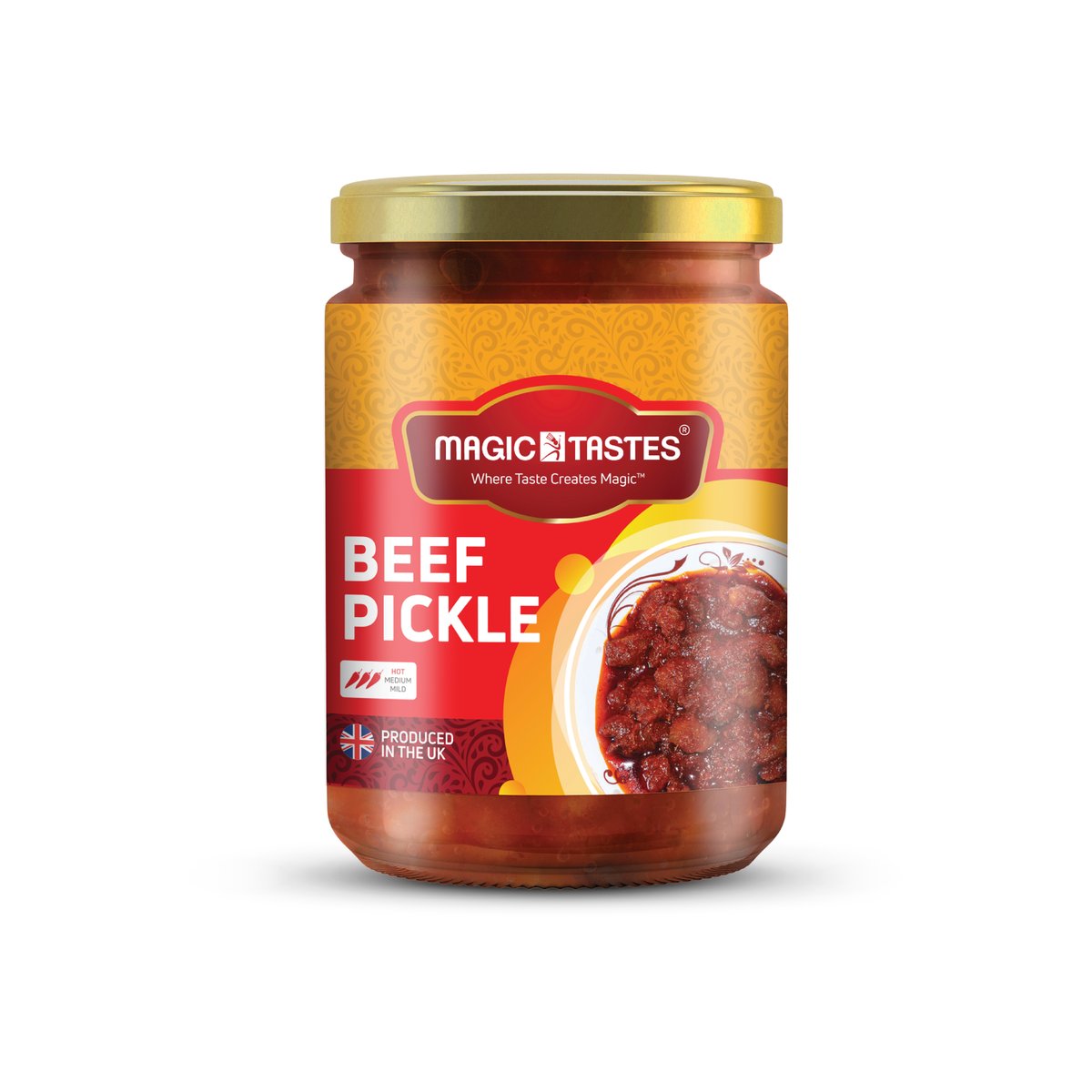 Magic Tastes Beef Pickle, a spicy condiment, offers a medium heat level, making it a great addition to enhance your meals with its rich, savory flavor.