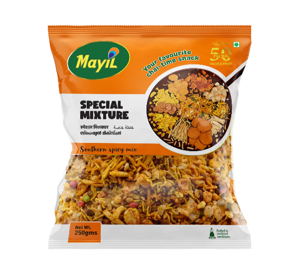 Relish the authentic crunch and flavor of South India with Mayil Special Mixture. Made with a blend of crispy sev, fried lentils, crunchy peanuts, curry leaves, and a medley of spices, this snack is the perfect partner for your tea-time cravings.