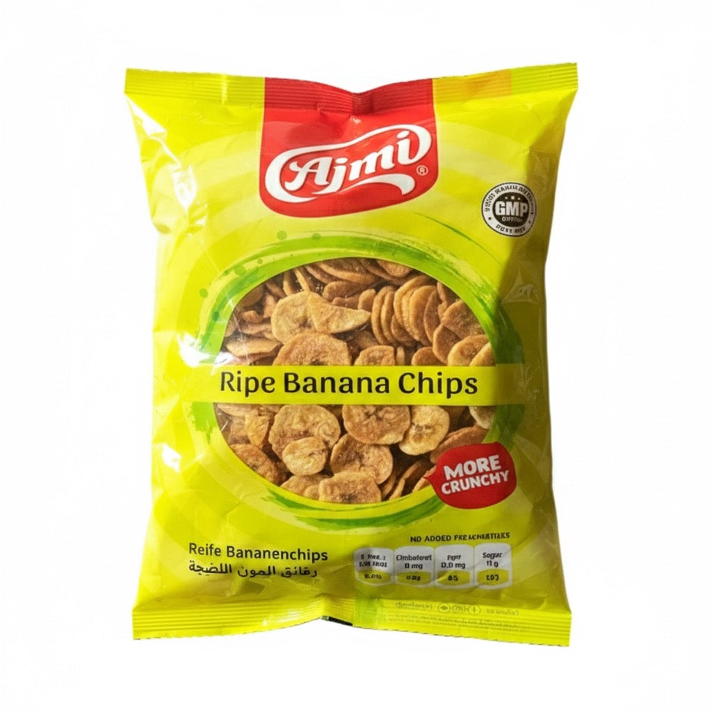 Enjoy the delicious crunch of Ajmi Ripe Banana Chips! Made from premium ripe bananas, these GMO-free, preservative-free snacks offer a healthy treat with 0mg cholesterol, 0.8g iron, and 11g sugar per serving. Perfect for a quick, nutritious snack on the go!