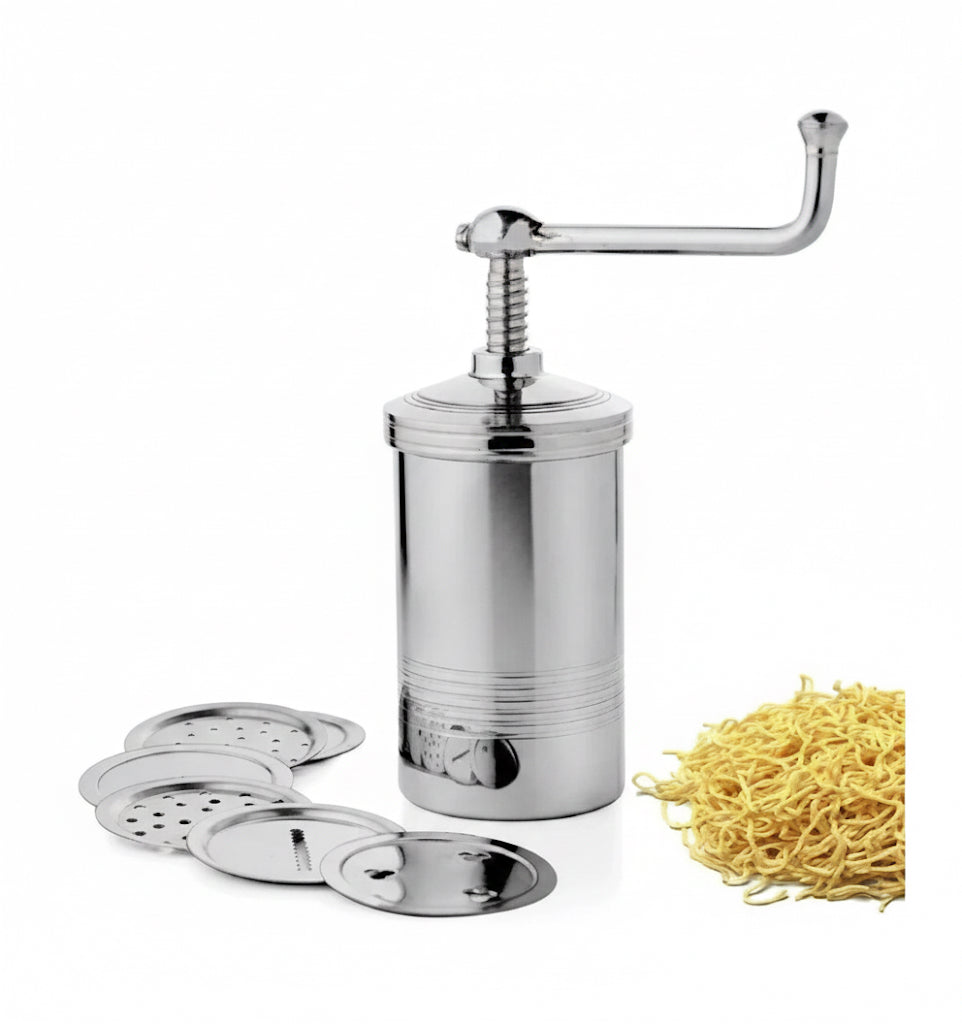 The classic, heavy-duty stainless steel press is an essential tool for creating perfect homemade snacks. Easily make soft Idiyappam (String Hoppers), Sev (Bhujia), Chakli (Murukku), and other noodle-like treats. Its comfortable screw mechanism and interchangeable discs make kitchen work quick and easy.