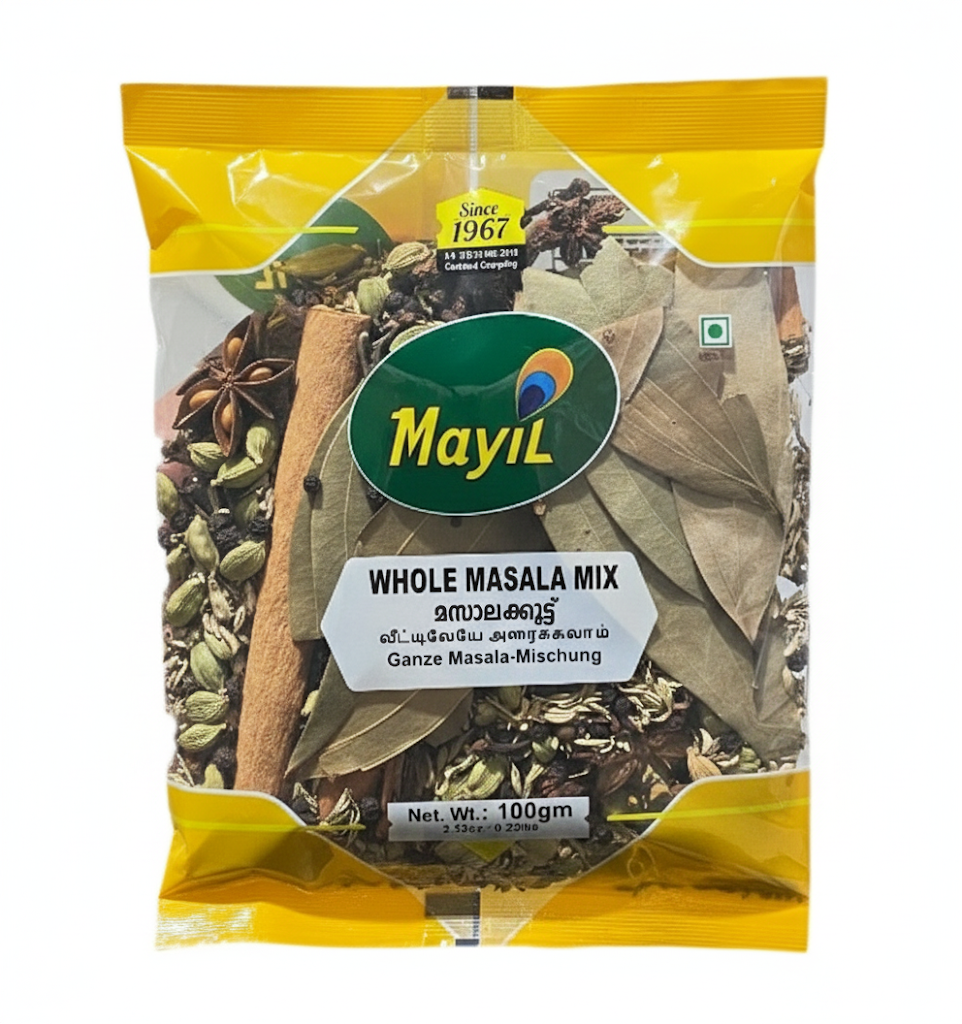 Elevate your curries and biryanis with the rich aroma of Mayil Whole Masala Mix. This premium 100 g blend features a selection of whole, untouched spices like cinnamon, cardamom, bay leaves, star anise, and more. It's the essential foundation for any authentic, flavorful Indian dish.